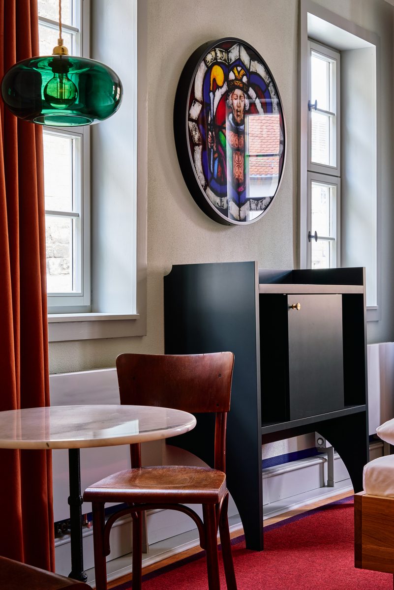 Die Ausstattung knüpft an das Ornat, die festliche Amtstracht der Bischöfe an. Hinterleuchtete Glasfenstermotive aus dem Westchor des Naumburger Doms zeigen die zehn Bischöfe, die den Zimmern zugeordnet sind. Ihre Farbigkeit findet sich im Mix der Ausstattung von historischen, neuen und für das Objekt entwickelten Möbeln wieder.